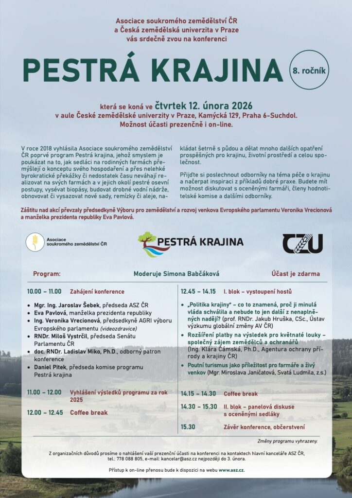 Asociace soukromého zemědělství ČR a Česká zemědělská univerzita v Praze zvou na 8. ročník konference PESTRÁ KRAJINA. Konference přináší inspiraci, jak rodinné farmy v praxi pečují o krajinu: od pestrých osevních postupů a biopásů přes drobné vodní nádrže až po obnovu sadů, remízků a alejí či šetrné hospodaření s půdou.